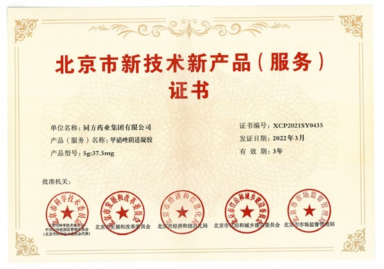 近日,我司生產(chǎn)的甲硝唑陰道凝膠榮獲北京市新技術(shù)新產(chǎn)品(服務(wù))證書。